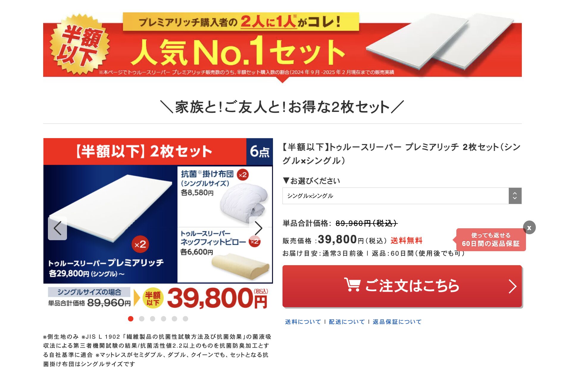 トゥルースリーパー公式HPでは、単品販売以外にも、枕や掛布団のセットを特別価格で販売している場合もありますので、お得に買えますよ。