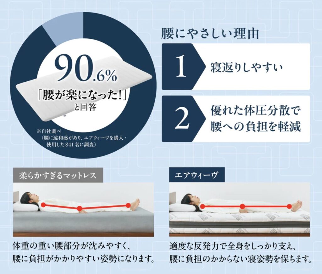 - 腰痛対策:「沈み込みすぎないため、朝起きた時の腰の重さが軽減された」