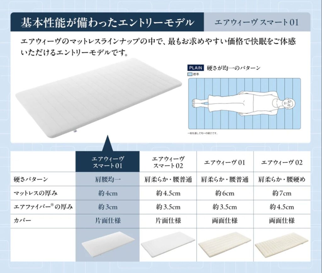 | 項目 | エアウィーヴ スマート01 (エントリー) | エアウィーヴ 01 (スタンダード) |