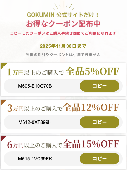 「GOKUMIN・プレミアムスプリングマットレス」は、公式HPから1万円以上購入で、3%割引クーポンがもらえるキャンペーンなどを定期的にやっています。