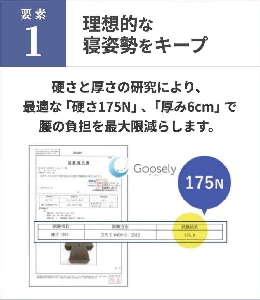 グースリーマットレスの硬さは175Nで固定されているため、使う方の体重によって寝心地の感じ方が変わる可能性があります。