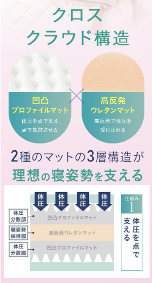 この評価の背景には、独自開発の「クロスクラウド製法」による体圧分散性の高さが関係しています。
