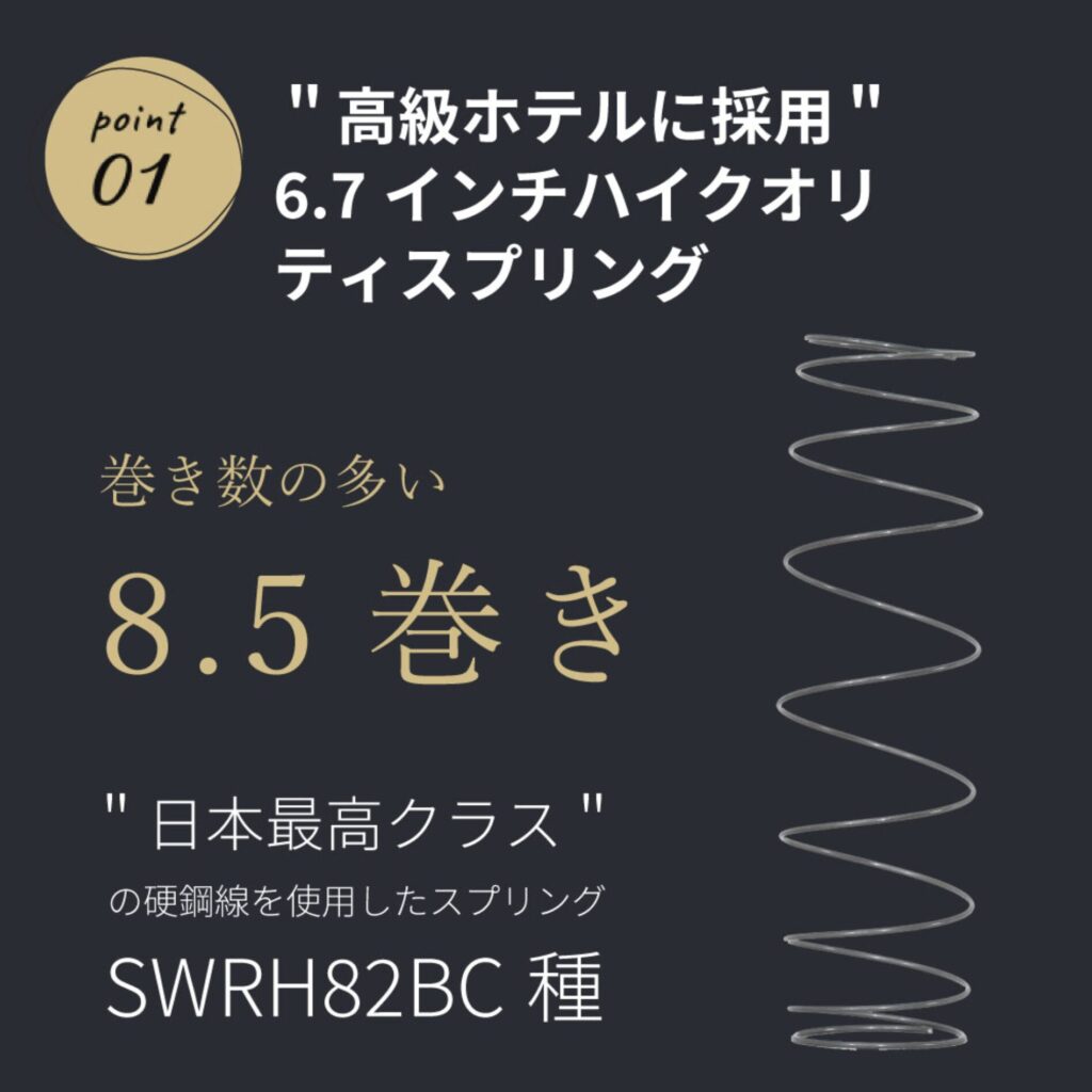 - コイル: 6.7インチ・8.5巻のポケットコイル(JIS基準で最高クラスの硬鋼線SWRH82BC種)を使用