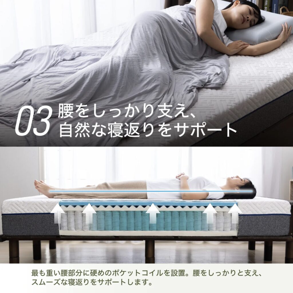 腰部強化ゾーンの硬めコイルが沈み込みを防ぐ設計のため、腰痛改善を実感する口コミが多い傾向があります。