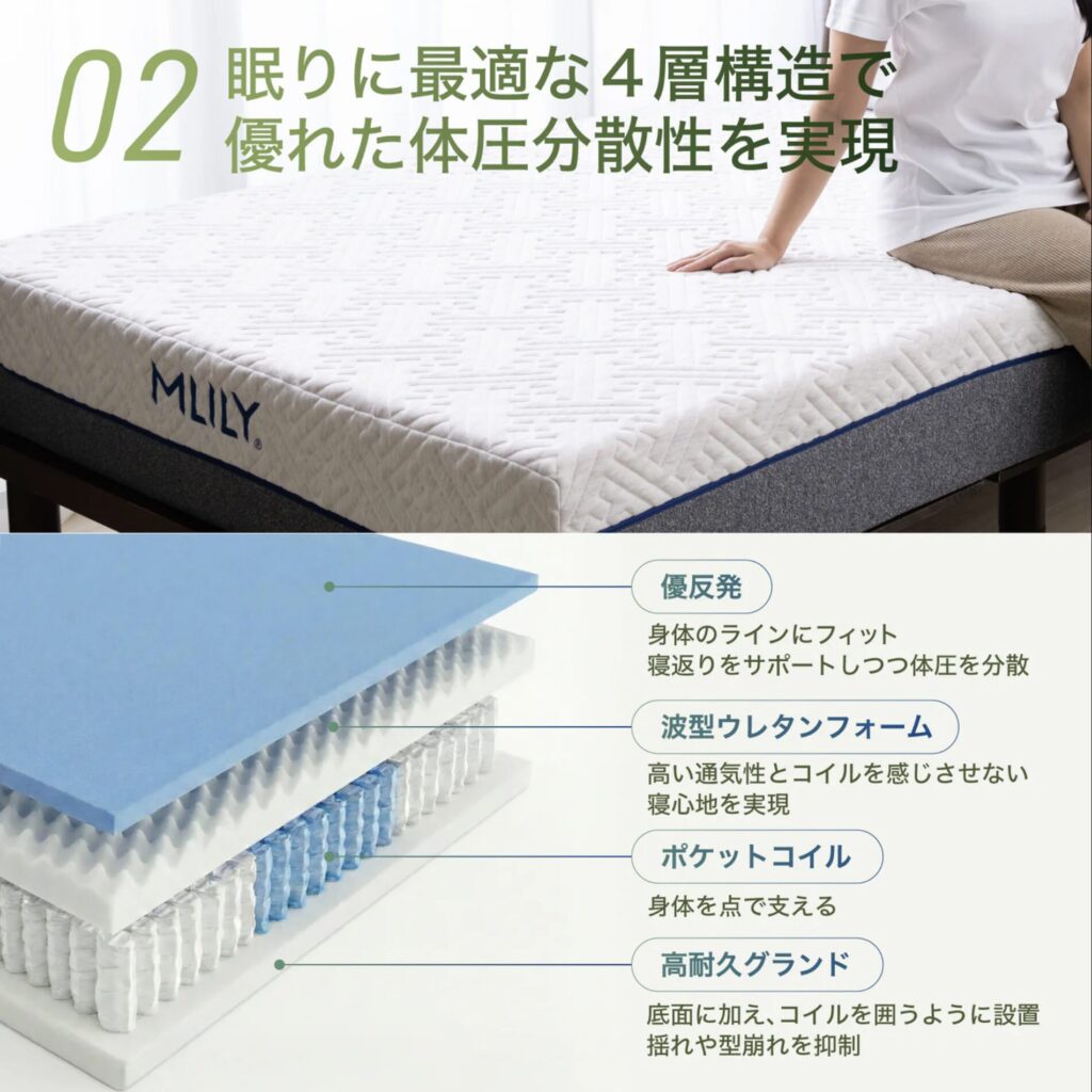 エムリリー ハイブリッドマットレスは、口コミ★4.6の高評価に裏付けられた、腰痛特化設計の4層構造マットレスです。