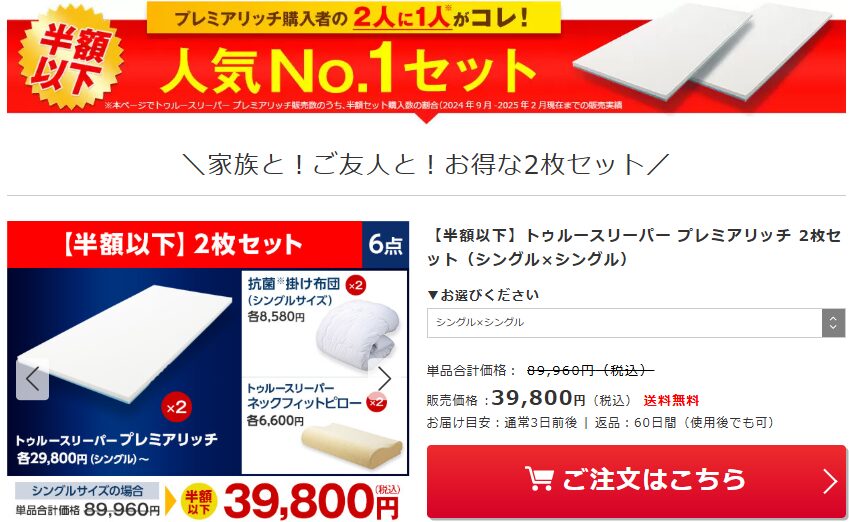 トゥルースリーパー公式HPでは、単品販売以外にも枕や掛布団のセットを特別価格で販売しており、お得に買えますよ。