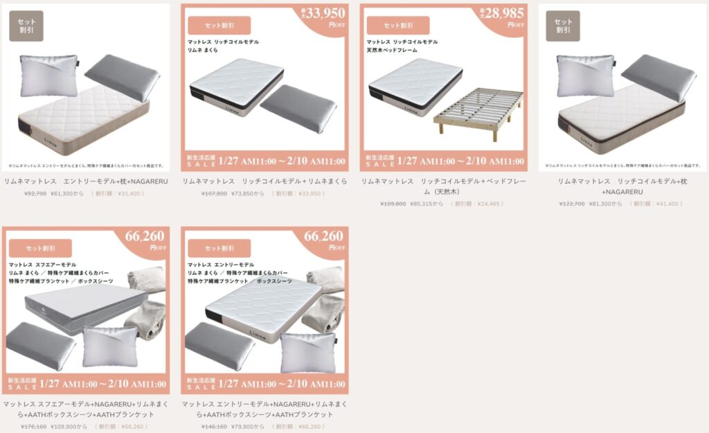 • 価格はシングルは同価格、それ以外は「リムネマットレス」の方が安い