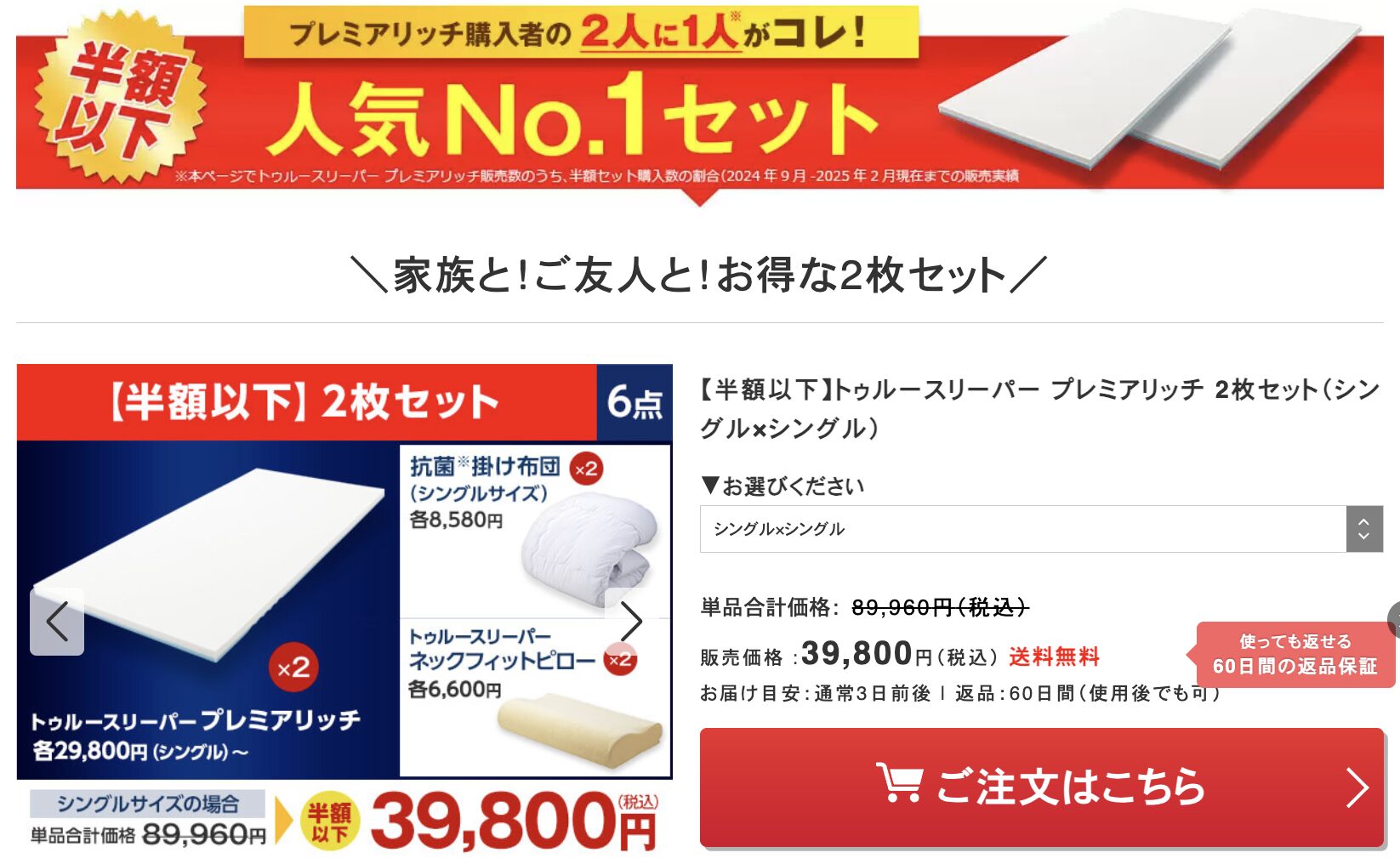 トゥルースリーパー公式HPでは、単品販売以外にも、枕や掛布団のセットを特別価格で販売している場合もありますので、お得に買えますよ。