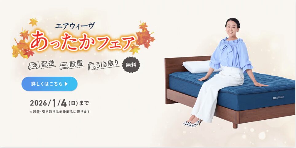 エアウィーヴ公式HPでは、期間限定特別販売や限定クーポンの配布など定期的にやっています。